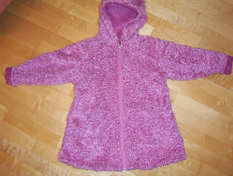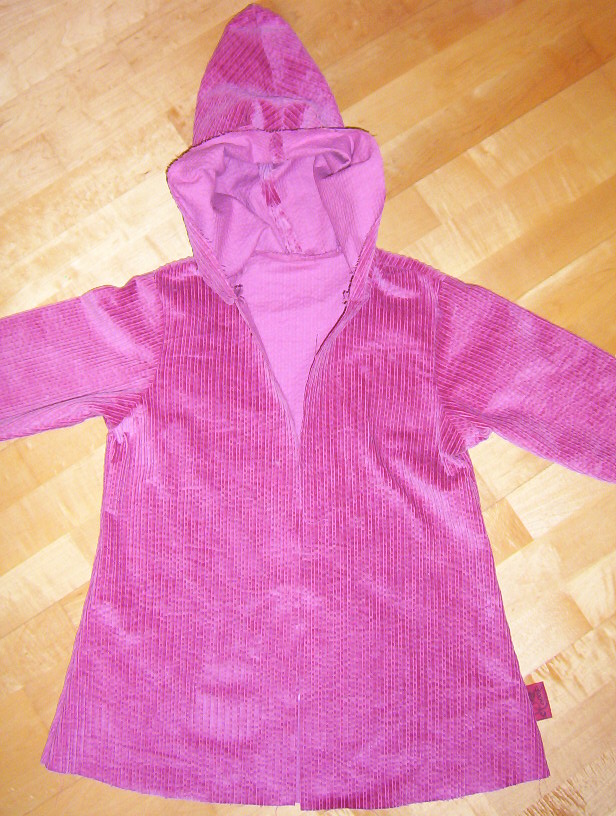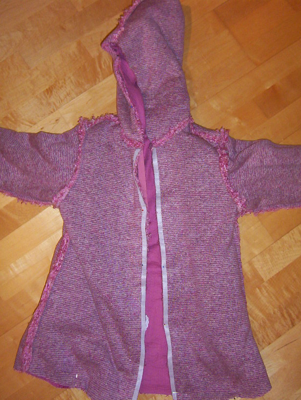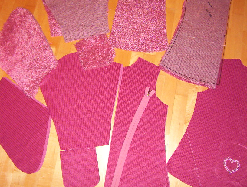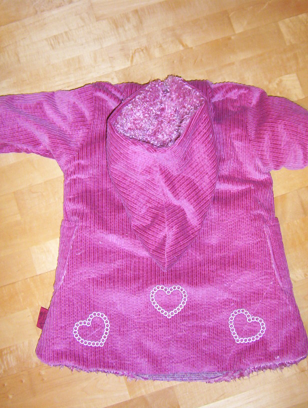 Dann werden beide Jacken an der Außenkante der Kapuze, den Vorderkanten und am unteren Saum zusammengenäht. Dort läßt man ein Stück offen zum Wenden (sollte nicht zu klein sein, sonst wird´s hinterher schwer!)