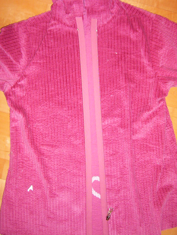 dann klebt man den Wendereißverschluß mit Wondertape auf die rechte Seite der Cordjacke, die Zähne zeigen hierbei nach innen (Geht natürlich auch mit Stecknadeln, aber Wondertape ist schon toll!) |