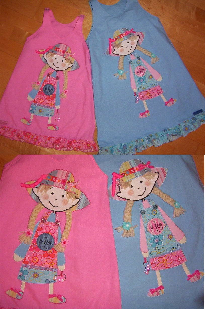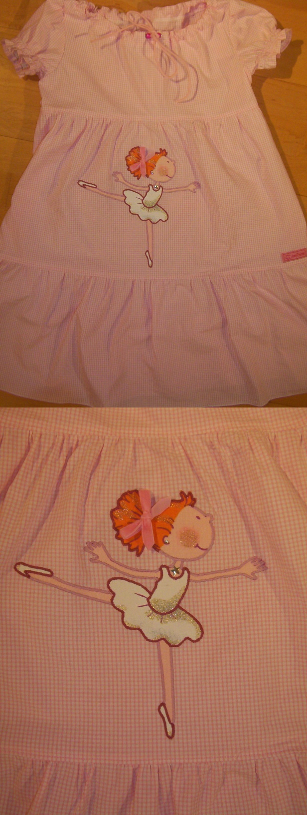 Kleid aus leicht gecrashtem Vichy-Karo in zart-rosa/weiß (die Farbe auf dem Bild ist vieeeel zu dunkel); Modell aus der aktuellen Sabrina Kids; Gr. 122; war schon länger fertig, es mußte aber auf Wunsch einer einzelnen Dame unbedingt eine Ballerina drauf, weil die auf der Jeans-Jacke ja HINTEN und somit nicht zu sehen ist..... war ein bißchen fummelig, aber dafür wird sie mich morgen früh lieben, wenn sie es entdeckt... Der Schnitt ist total schön, den werde ich wohl noch öfter benutzen, nächstes Mal mit einem Stoff, der noch leichter fällt; Modell-Bilder folgen bald :-) |