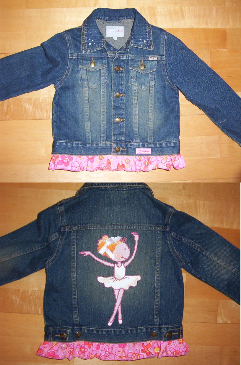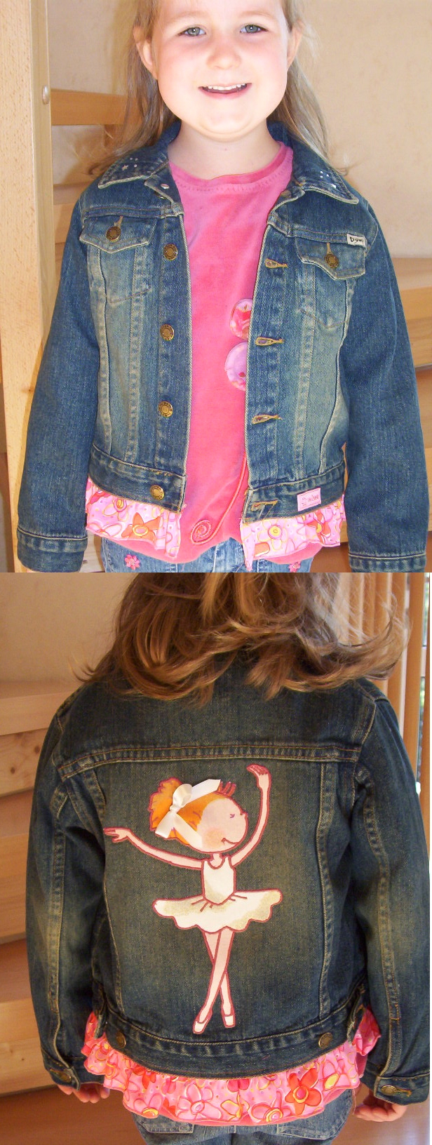 Aus Alt mach Neu; ehemals komplett schlichte Jeansjacke von H+M; jetzt mit applizierter Prinzessin mit Satin-Schleife im Haar; bunter Rüsche und Glitzer Sternen und Kreisen auf dem Kragen; da strahlt meine große Ballett-Tänzerin!