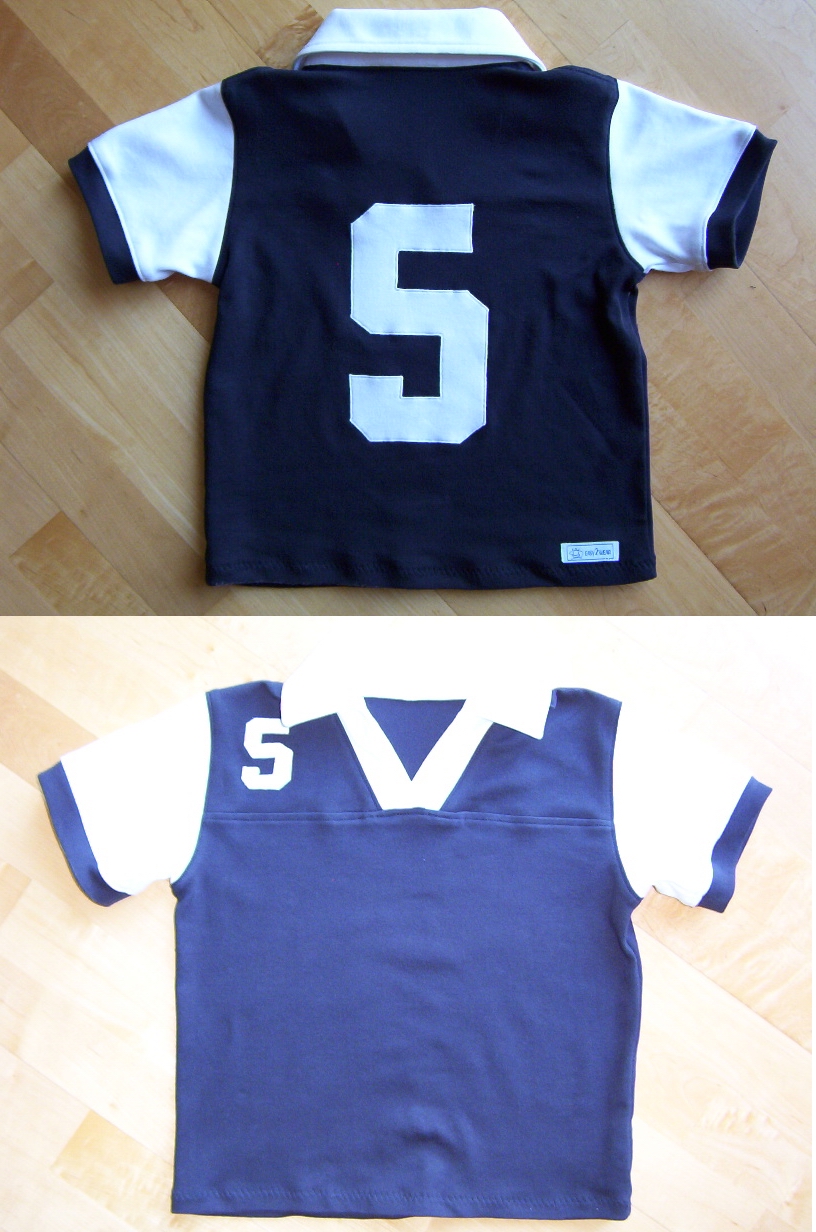Fußballshirt in weiß/dunkelblau; Gr. 110; Schnitt aus der Ottobre 2/2005; mit applizierten 5en; die Farbe stimmt nur auf dem Bild von hinten |