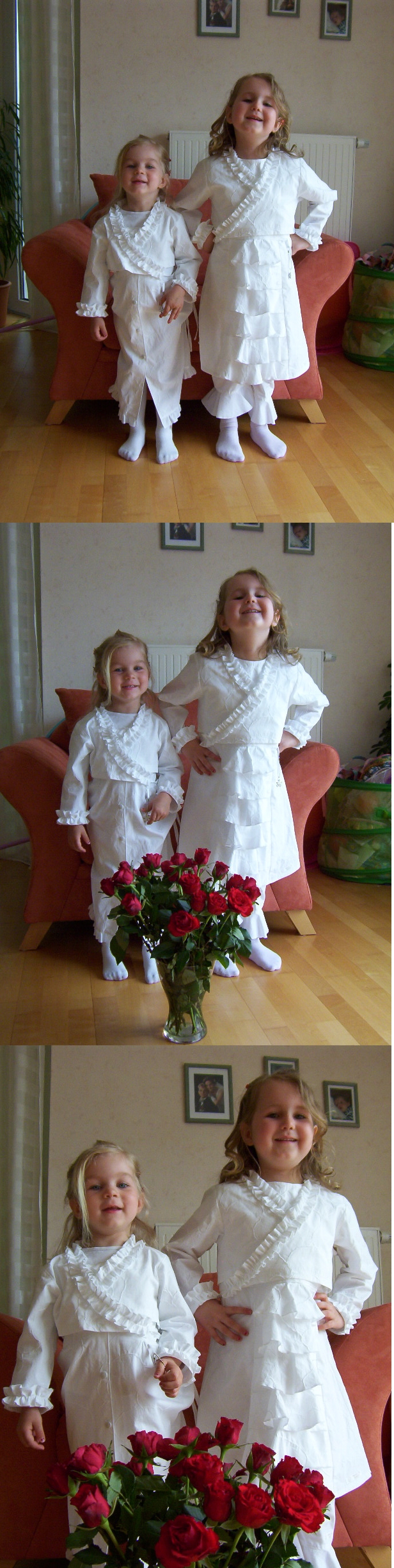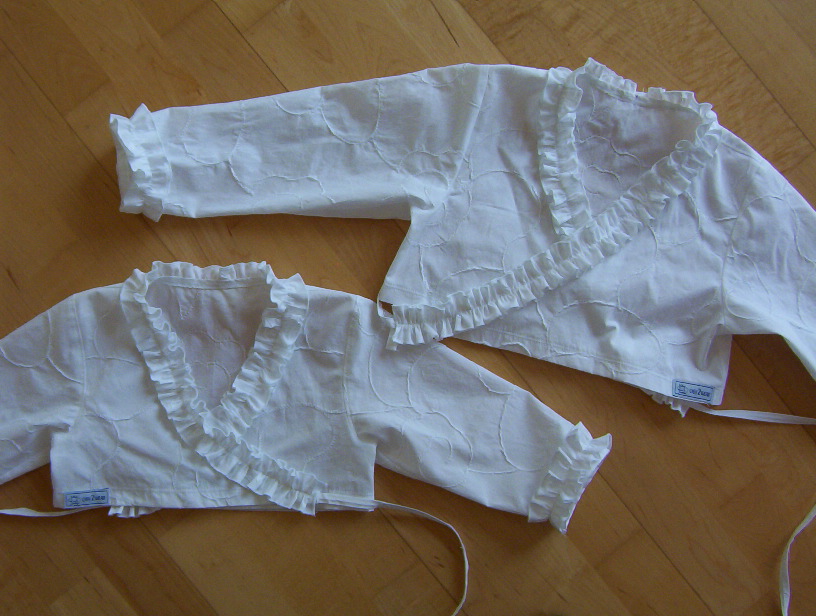 Kurzjäckchen zum Binden, passend zum weißen Outfit, aus organic lycra; Bizzkids Modell 2813; Gr. 104 und 128; ein Komplettbild von beiden Mädels in voller Montur folgt... das erste Modell mit meinen neuen Labels...man kann sie nur leider nicht so richtig erkennen! |