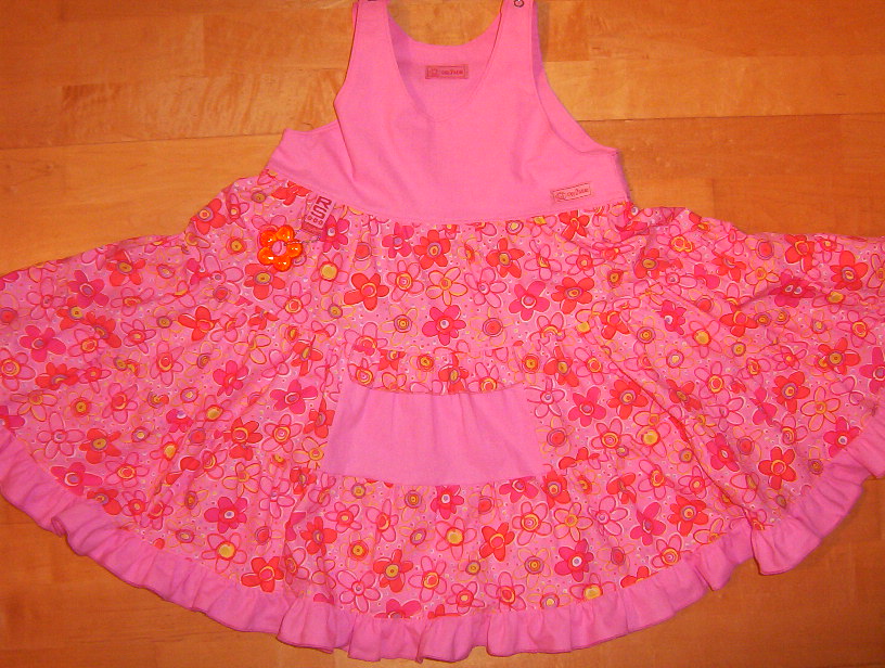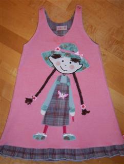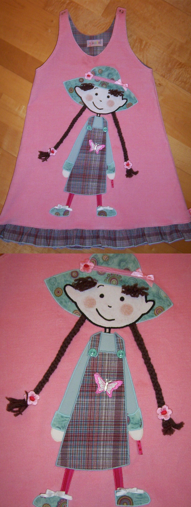 Und mal wieder eine Lisa... :-) aus velvet in pink icing, mit Rüschen und Belegen aus kariertem Flanell; das bewährte Modell 2609 aus der Sommer-Bizzkids 2004, Gr. 104; diesmal trägt Lisa einen schicken Hut; das Anhänge-Tier fehlt noch.