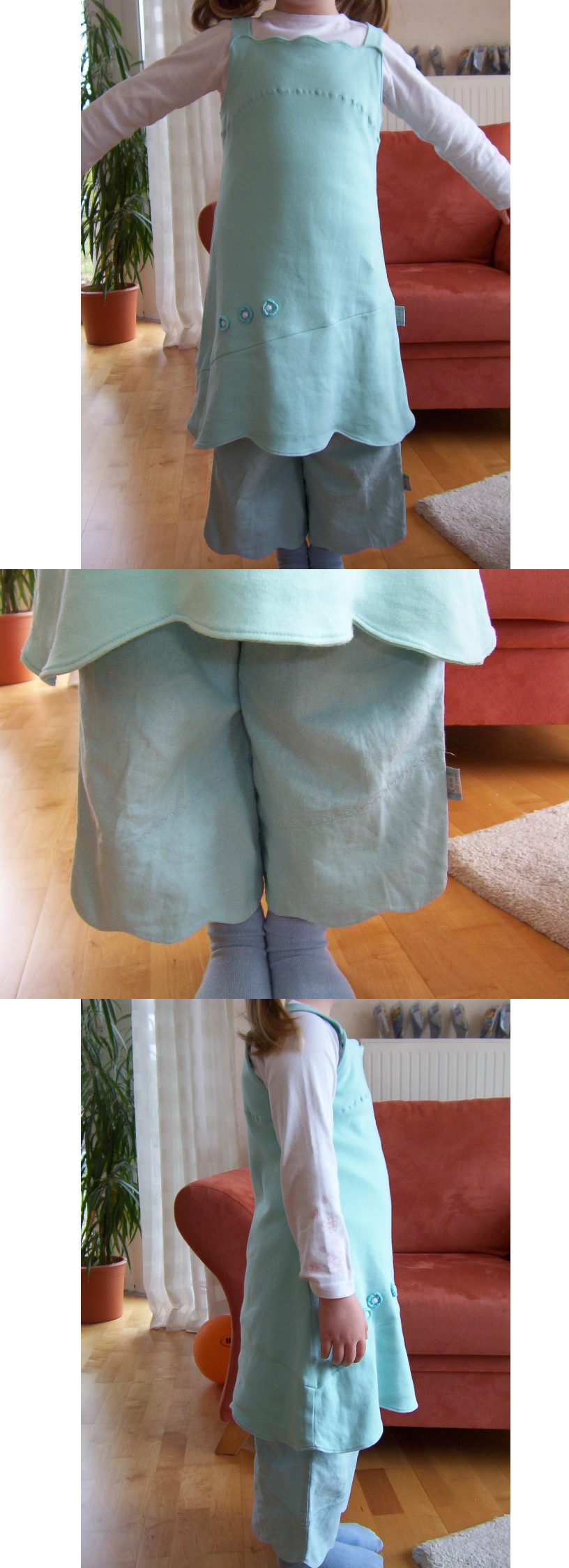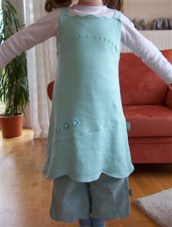 vom letzten Sommer; war mein "Zweitwerk"; aus interlock und leinen in aqua; nach Roos-Schnitt 2096; Gr. 116 |