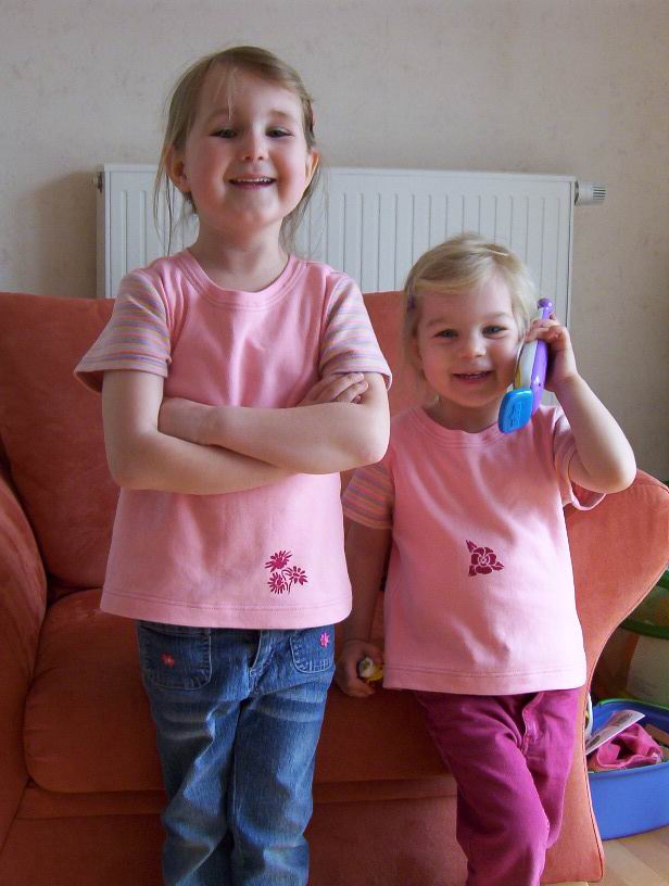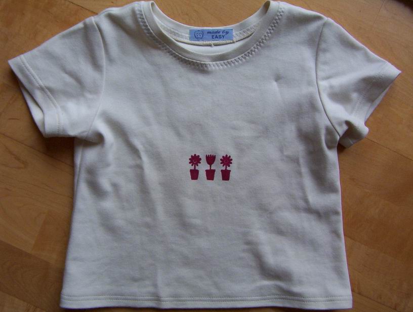 Und noch ein T-Shirt; aus weißem Interlock mit Druck; nach Roos-Modell 3008 F, Gr. 128. Der Druck entstand wieder mit Textilfarbe und Schwamm; jetzt haben wir eine Cappucino-Schablone weniger... |