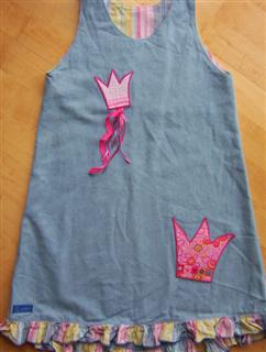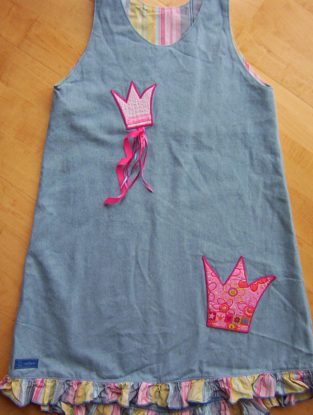 Jeans-Kleid mit Rüschen und Kronen-Applikation; hinten länger als vorne, Gr. 122, eigener Schnitt; mit Druckknöpfen auf der Schulter; sieht ein bißchen ungebügelt aus, besseres Foto folgt! |