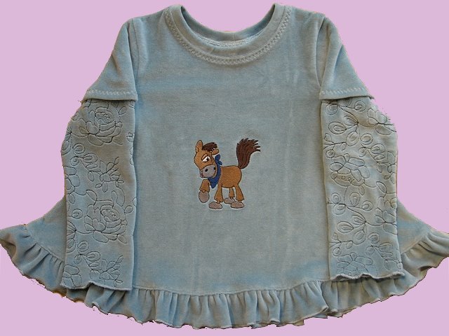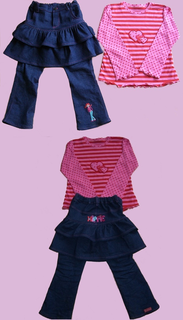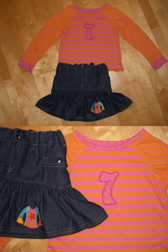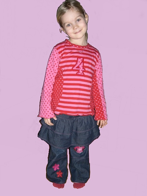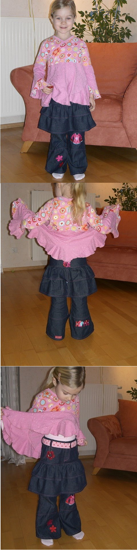 Noch eine Rockhose aus leicht elastischem Jeans; mit Girly vorne und Hippie-Schriftzug auf dem Po; das Shirt ist aus Sanetta Jerseys.