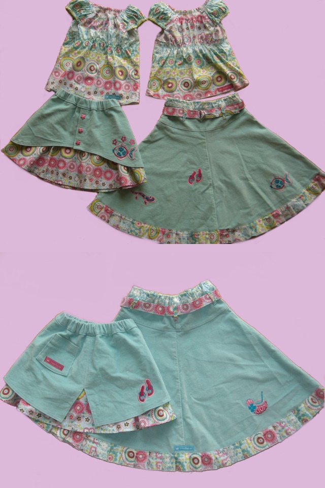 Zwei Sommerkombis aus glitzerndem Cord und Baumwollstoff; bestickt mit Mustern aus der Hawaii-Serie von Farbenmix.