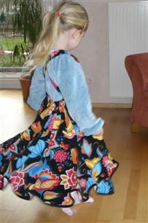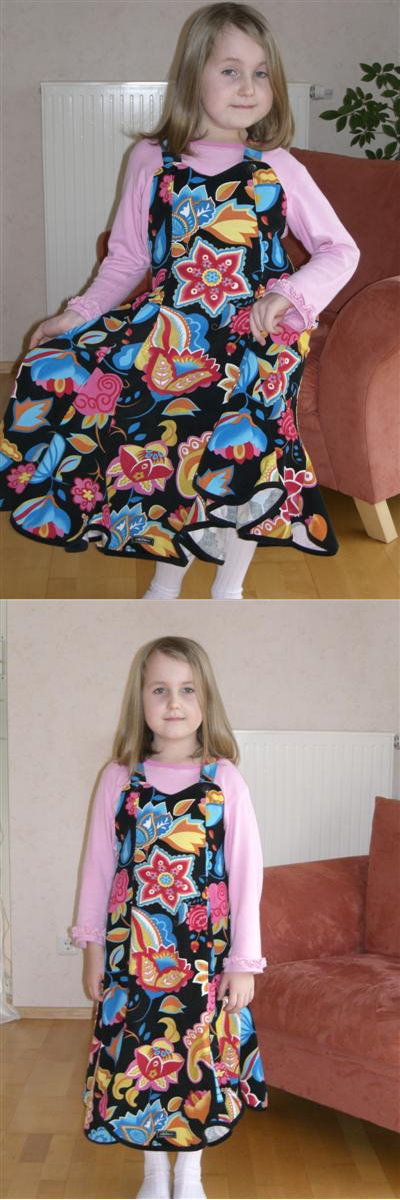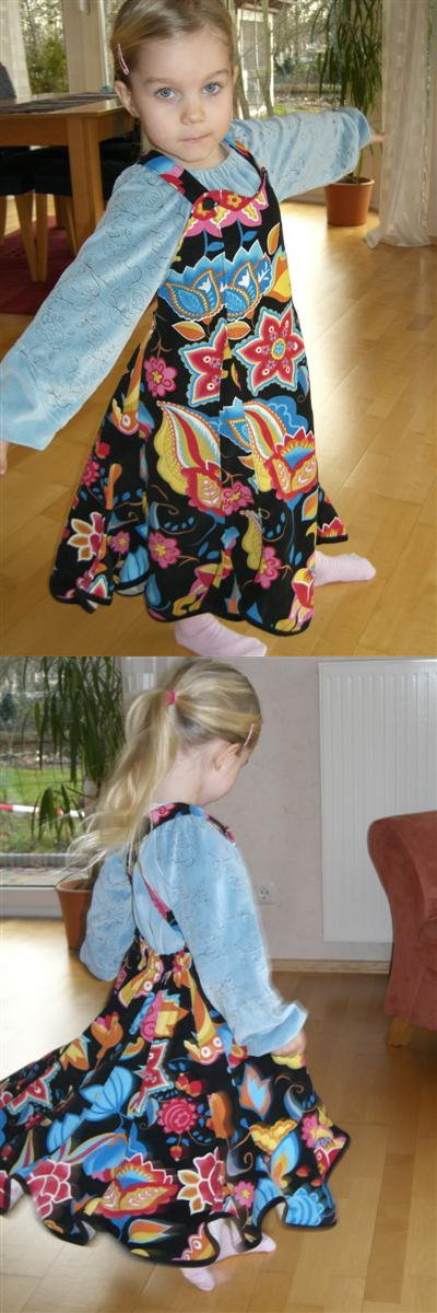 (Ich habe die Träger an der vorgesehen Stelle hinten festgenäht. So wird das Vorderteil seeeehr schmal, obwohl insgesamt reichlich Weite vorhanden ist. Lucie hat dann also Hannahs Kleid in 122/128 bekommen und Hannah ein neues, größeres in 134/140; so sind sie zwar sehr lang, anders ging es aber dann nicht mehr. Beim nächsten setze ich die Träger hinten weiter ins Rückenteil)