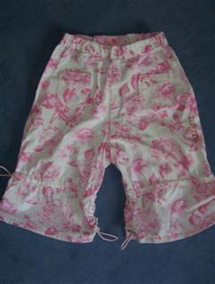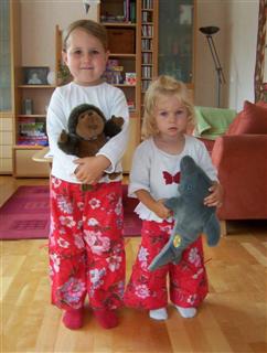 Nochmal zwei Hosen nach Roos Modell 2094 B, diesmal ohne Taschen und Gürtelschlaufen; aus poplin oli print kirsch; Gr. 92 und 116; das Shirt mit Schmetterlingsapplikation ist ein eigener Schnitt.