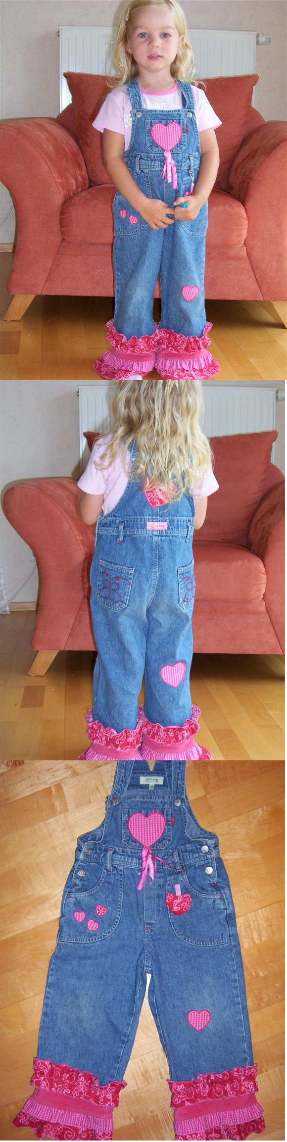 Aus-Alt-Mach-Neu Latzhose; war mal von H+M, Gr. 92; jetzt hat sie Rüschen, Volants am Saum; applizierte Herzen; Korkenzieher-und Satinbänder; ein passendes abnehmbares Herzchen an der Kugelkette; jetzt hat sie ca. Gr. 104/110 und ist Lucie leider eine ganze Ecke zu lang. Also kriegt sie eine andere :-)