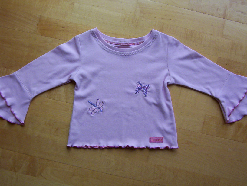 Aus alt mach neu;.... Das war mal ein Shirt von mir; jetzt ist es eins für Lucie; eigener Schnitt, Gr. 104; mit Trompetenärmeln und Rollsaum; die Schmetterlinge und die Libelle sind das erste Werk mit meiner "Neuen"... Ein Model-Foto folgt.