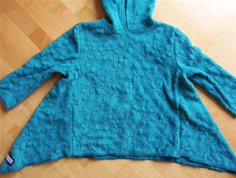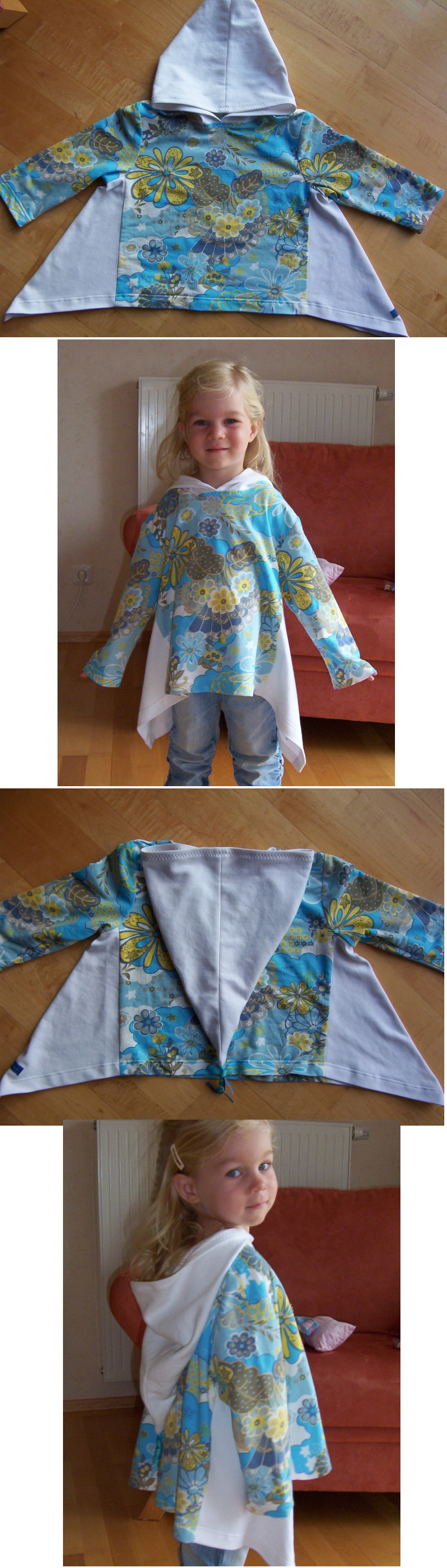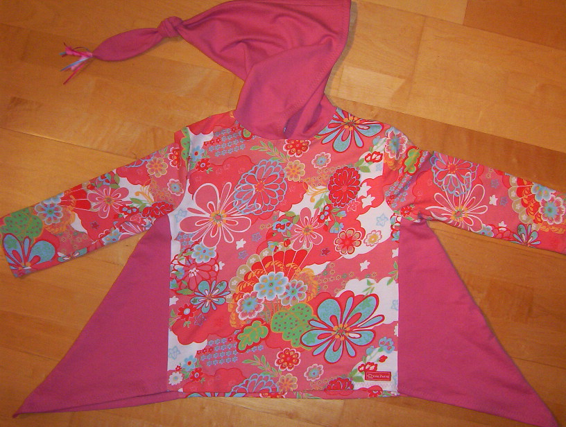 Und noch ein "Anjana"; aus dünnem Sweat-Stoff und weißem Interlock; genäht in Gr. 92/98; entspricht eher 104/110; bei dem dünnen Stoff noch seehr reichlich für Lucie; aus dickem Fleece paßt die Größe besser... Änderung: Zipfelkapuze ein ganzes Stück gekürzt, da ich sie nicht knoten will.