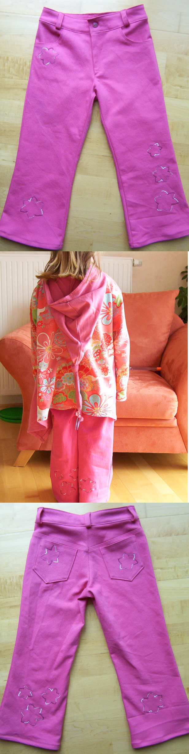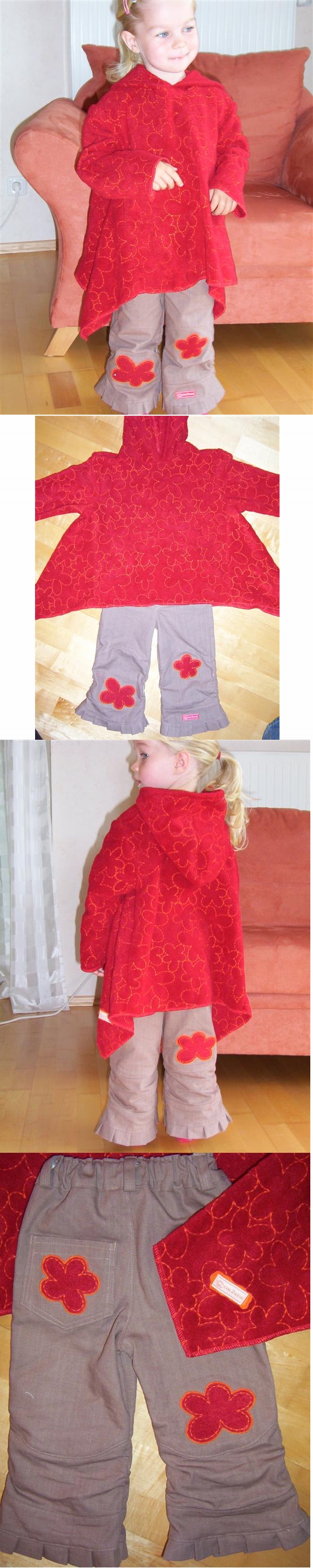 Eine Winterkombi mit strahlender Besitzerin :-)) Hose aus "linnen look cotton" mit Blumen aus dem Pullistoff auf Filz appliziert; dazu ein Kuschelpulli aus besticktem Fleece; Schnitte: Hose "Dortje"; Gr. 92/98, in der Weite habe ich die Nahtzugaben weggelassen (also 8cm schmaler als im Schnitt angegeben, so sitzt sie bei Lucie ideal); ohne Vordertaschen; mit Gürtelschlaufen; Pulli: "Anjana", Gr. 92/98; keine Größenänderung, nur die Kapuze habe ich zu einer normalen abgewandelt. Die tollen Schnitte gibt´s bei www.farbenmix.de