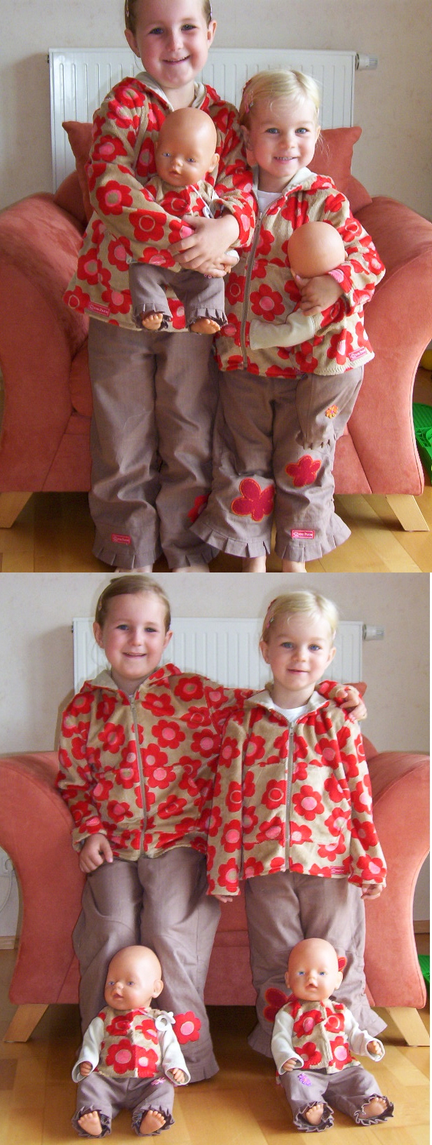 Zwei strahlende Puppen-Mamas; die Beschreibungen der "großen" Sachen stehen weiter unten; die Puppen-Kleidung findet Ihr unter Kreatives.