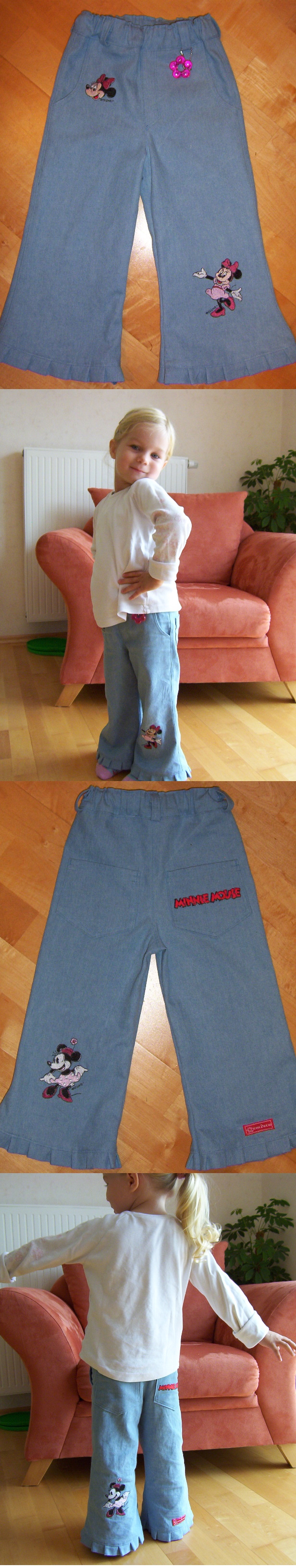 Eine "Minnie Mouse"-Hose; aus jeans uni in fog; Schnitt: abgeänderte Dortje; (Gr. 92/98; 10cm schmaler und ein bißchen länger; ohne Raffungen und Teilungsnähte; mit Gürtelschlaufen; Länge jetzt ca. 104; so paßt sie Lucie optimal: siehe Modelfotos) Ich mußte unbedingt die Disney-Motive meiner "Neuen" testen...