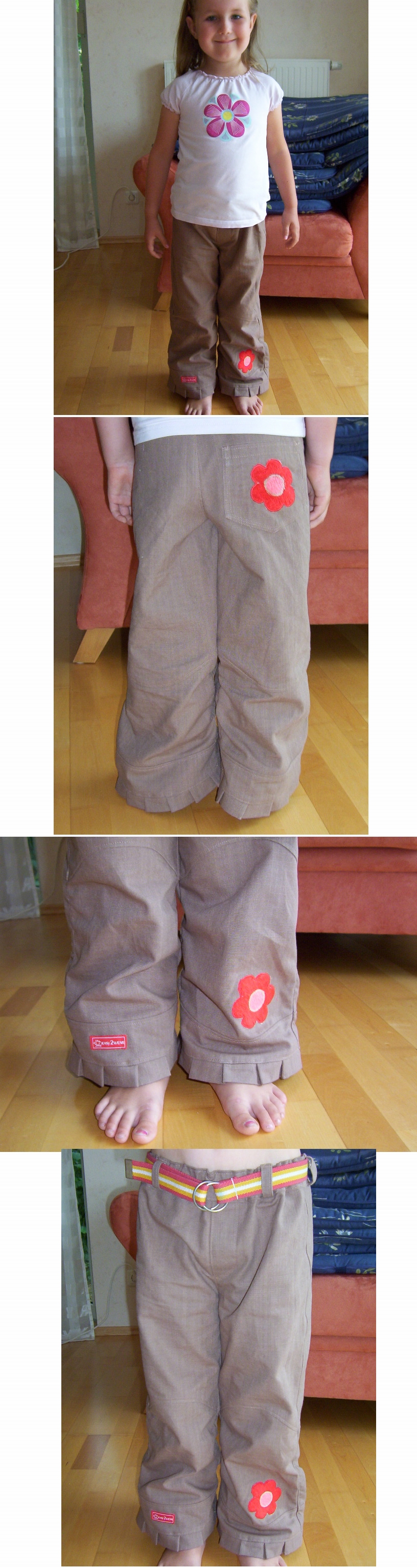Hose aus braunem "linnen look cotton"; mit applizierter Blume vorne und hinten auf der Tasche; nach Schnitt "Dortje" von www.farbenmix.de; Gr. 116/122; Änderungen: leicht gekürzt; ohne Vordertaschen (dazu war mir der Stoff zu fest); mit Gürtelschlaufen; fällt recht groß aus; sitzt aber toll! Passende Puppenhose unter Kreatives.