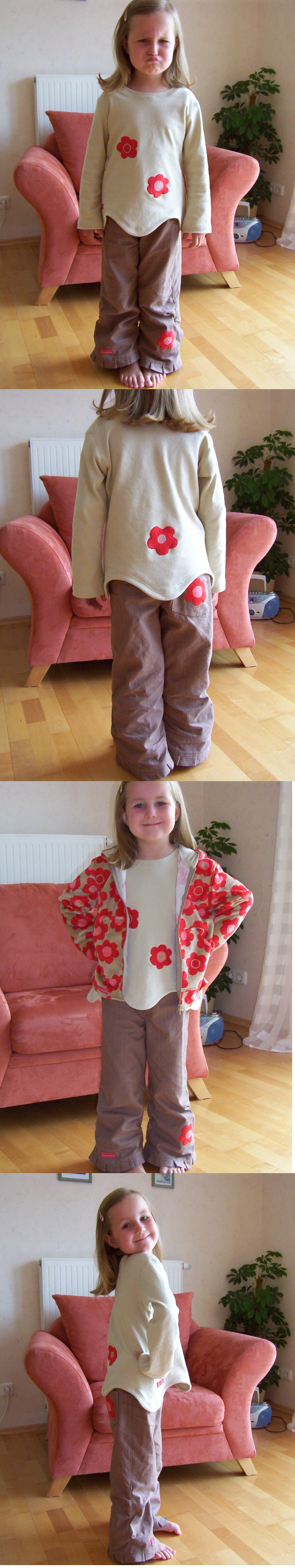 Shirt aus Interlock in "kit", mit Bogensaum und applizierten Blüten aus dem Microfun-Stoff; beim Anklicken gibt´s noch Kombi-Bilder mit der passenden Jacke; Schnitt: eigener, angelehnt an Roos 3008; ca. Gr. 122.