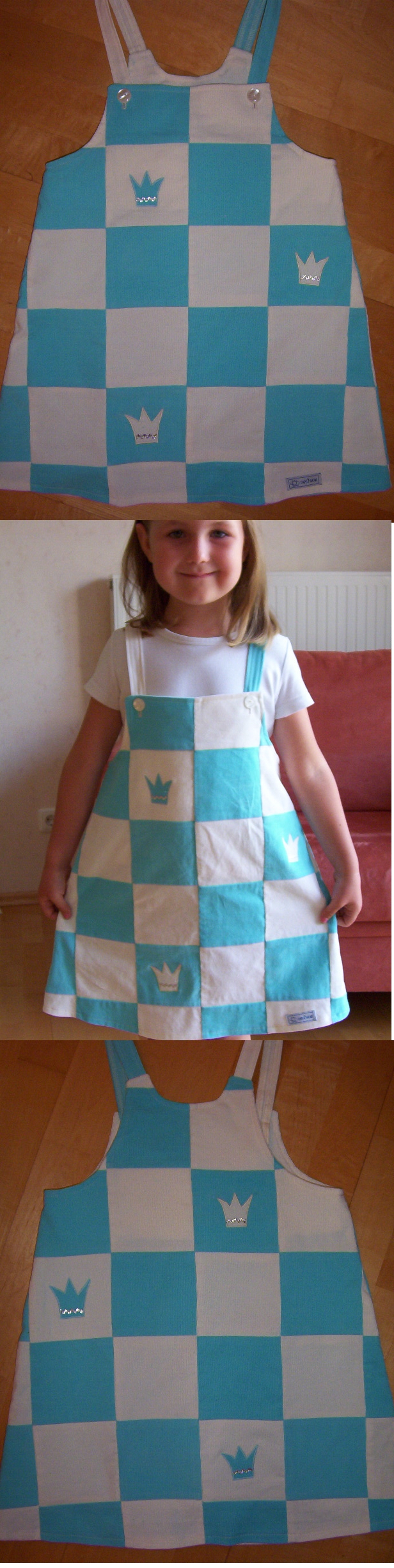Patchworkkleid aus Babycord in ecru und ocean; mit applizierten Kronen; für die Karos habe ich 12cm breiten Streifen aneinandergenäht, diese dann durchgeschnitten und versetzt aneinander genäht; was für eine Arbeit! Gr. 116/ 122, eigener Schnitt; das gleiche in 98/104 ist in Arbeit!