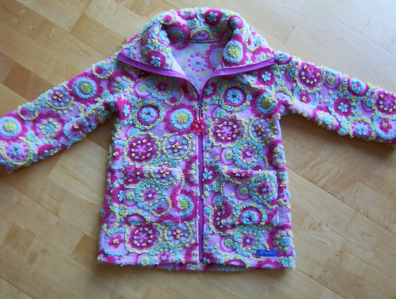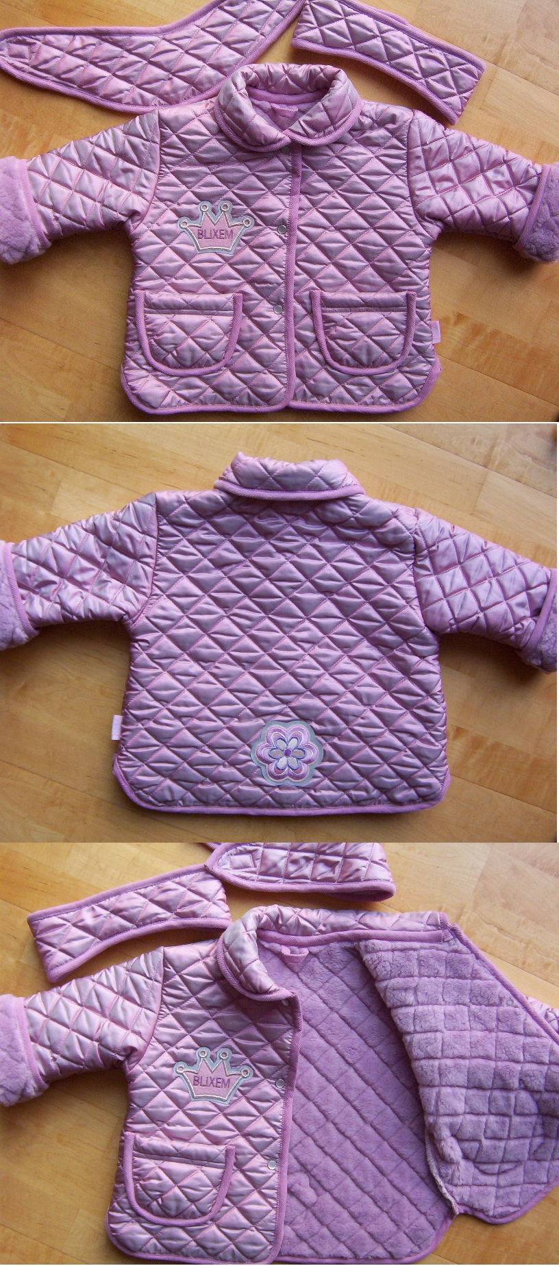 Eine supersüße Kuschelwinterjacke Gr. 80; mit passendem Stirnband und Halstuch; aus "Pinzacho rosa", eingefaßt mit rosa/lilanem Babycord; Schnitt: Modell 10; Ottobre 3/2004; mit Blixem-Krone auf Reflektorfolie; hinten ist eine Blume, auf Filz gestickt, mit Reflektorfolie unterlegt.