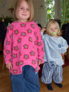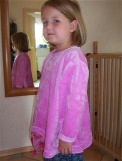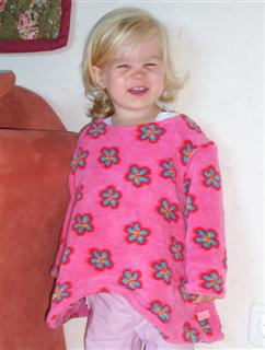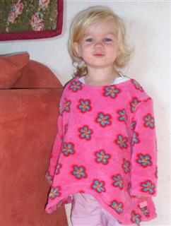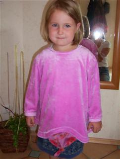 Ein Miou-Miou Pulli (V 2035), aus kuscheligem Microfun in bubblegum und Nicky flower bubblegum, in Gr. 116; das Bündchen am Hals habe ich weggelassen, er war sonst vieeel zu eng; der Schnitt fällt recht weit und lässig. Das 1. Bild von meiner "Lisa"! Die tolle Anleitung dafür gibt´s bei Sanna!