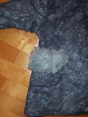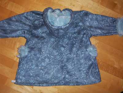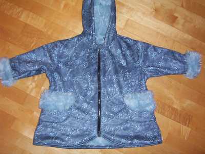 Der Traum von Winterjacke!! Die Fotos können es gar nicht so toll wiedergeben! Aus blauem Wildlederimitat mit Kuschelfell innen. Nach Roos-Schnitt 2084 B, die Taschen sind von Modell C; Gr. 116