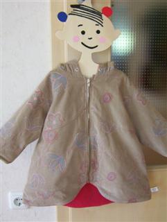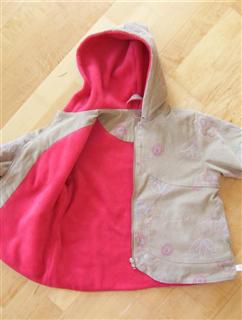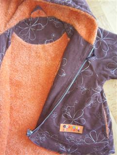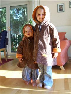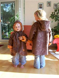 Die ersten beiden Winterjacken nach Roos 2084 B, aus besticktem Cord, gefüttert mit Zottelchen orange; mit Reißverschluß statt Knöpfen; Ösen an der Kapuze; in Gr. 92 und 116;