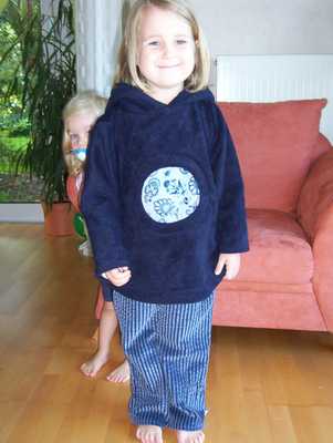 Fleece-Pulli in Navy, mit Einsätzen aus Nicky cashmere fog; Modell Roos 2043, Gr. 104, verlängert auf 110/116; Hose aus Breitcord, das Modell ist aus der Bizzkids 2/04; Modell 2722; allerdings ohne Taschen; mein erster Hosen-Reißverschluß, ich bin begeistert, er ist gelungen...den Pulli gibt es auch in Gr. 92, das Foto fehlt aber noch!