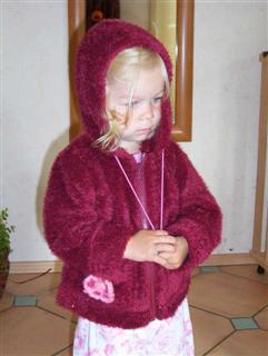 Jacke aus Zottelchen weinrot; nach Roos 2091 Modell G; mit Blumenapplikation und Gummikordel, in Gr. 92 und 116